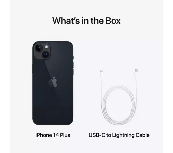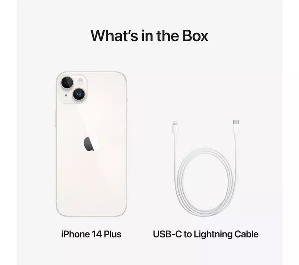Includes iPhone 14 Plus, USB-C to Lightning cable, and documentation.
