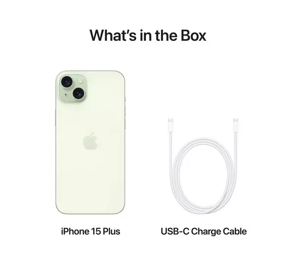 Includes iPhone 15 Plus, USB-C cable, documentation, and 1-year warranty.