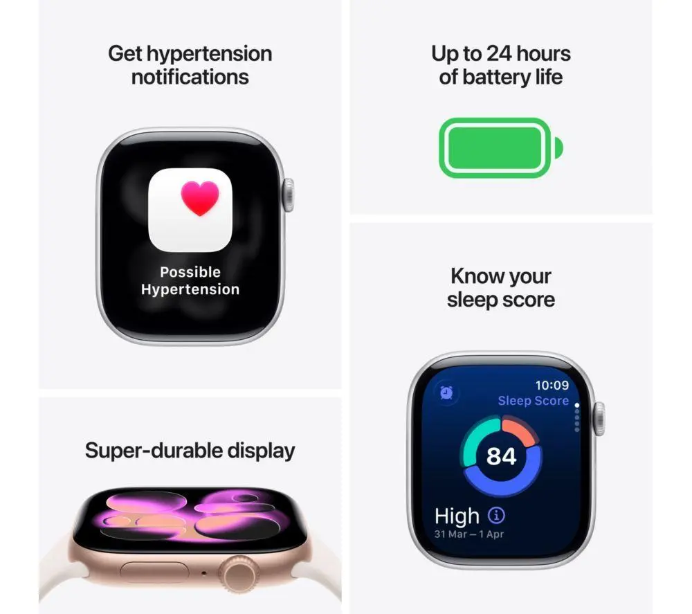- Display: 46 mm rectangular Always-On Retina OLED display with up to 2000 nits peak brightness and 326 pixels per inch for sharp visuals.